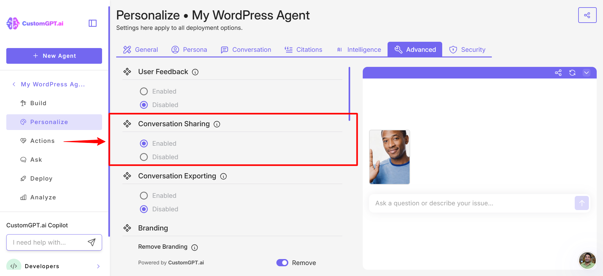 This guide explains how to manage conversation sharing settings for your AI Agent.