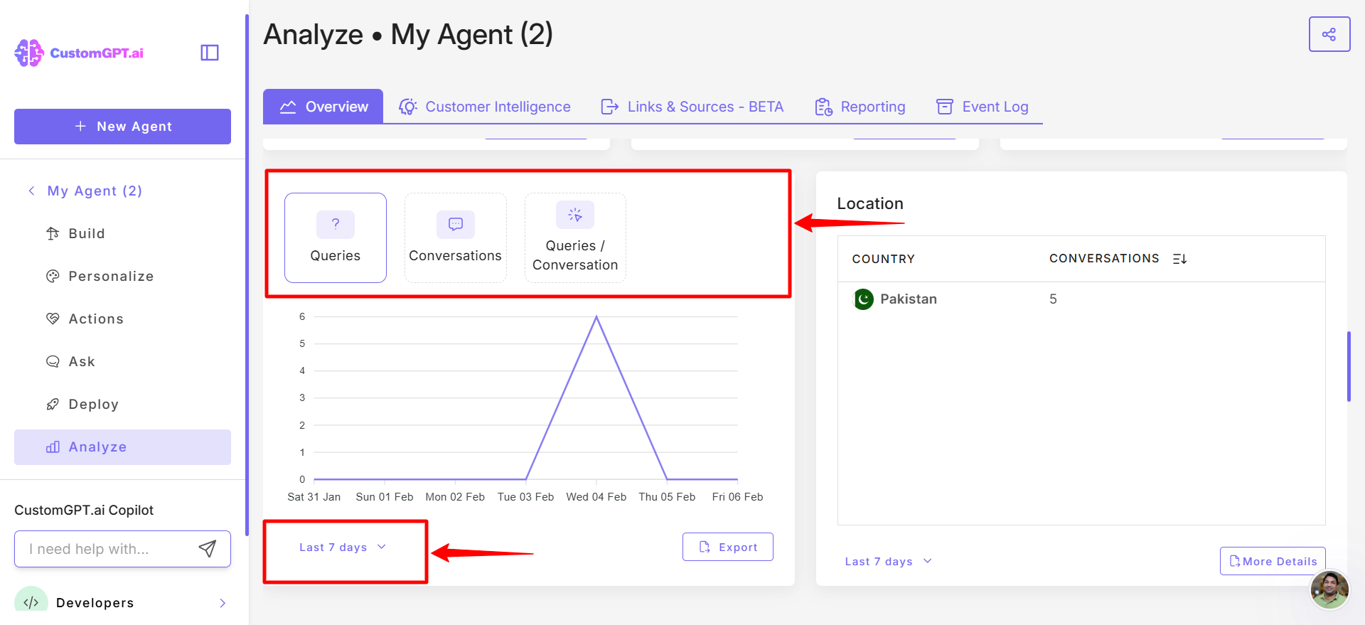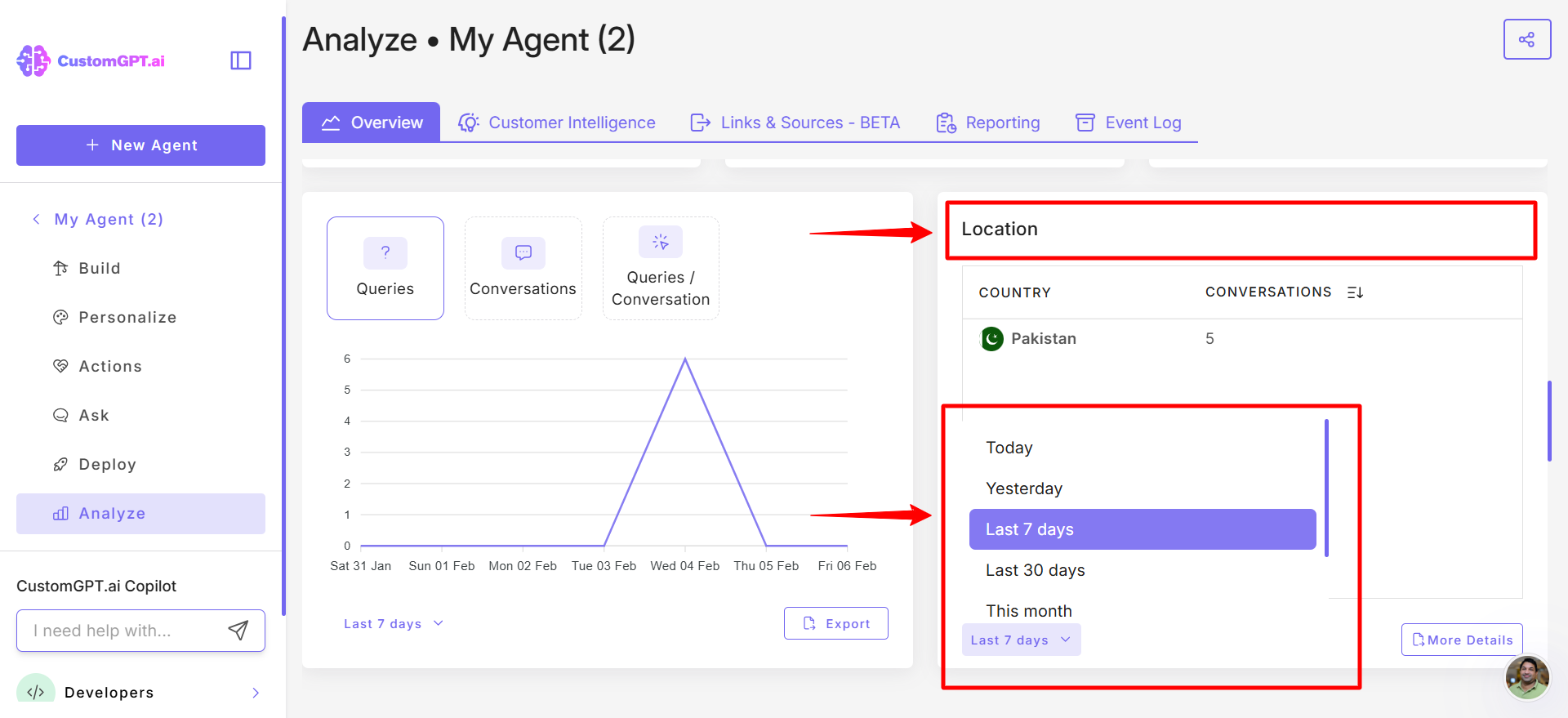- Scroll down to view the daily breakdown of Queries, Conversations, and Queries per conversation for detailed performance insights. You can filter data by Today, Yesterday, Last 7 days, Last 30 days, Last month, Last year, or a Custom range.
