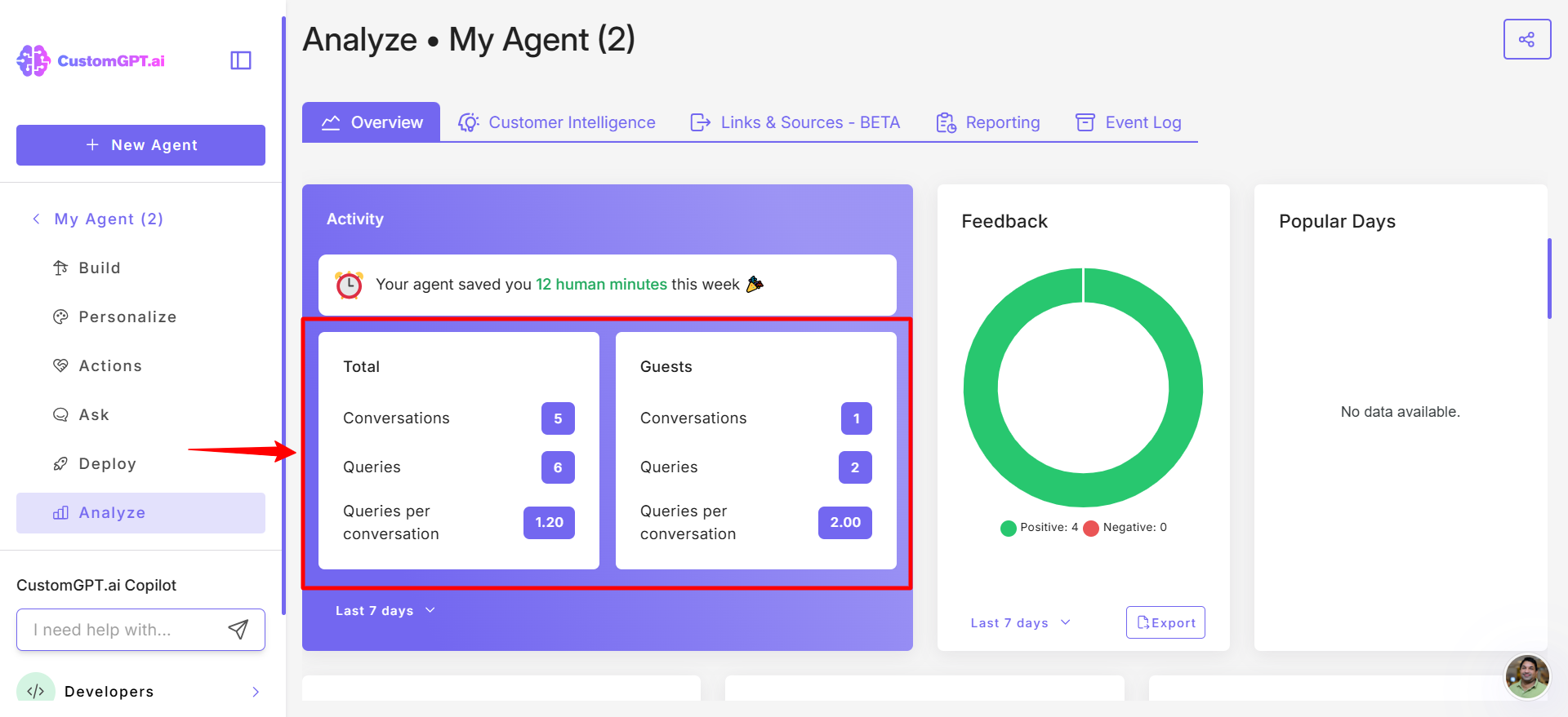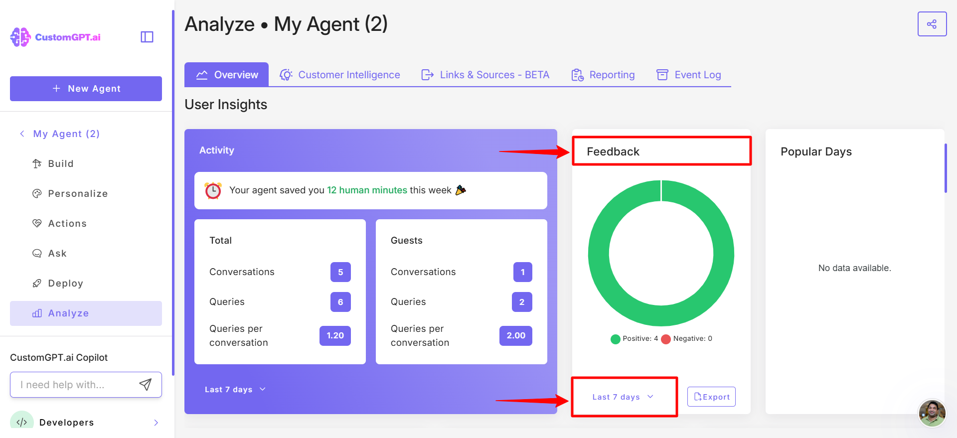 - In the "User Feedback" section, monitor the positive and negative feedback via the thumbs up/down system. Select a timeframe from the dropdown menu to view corresponding User Engagement metric.