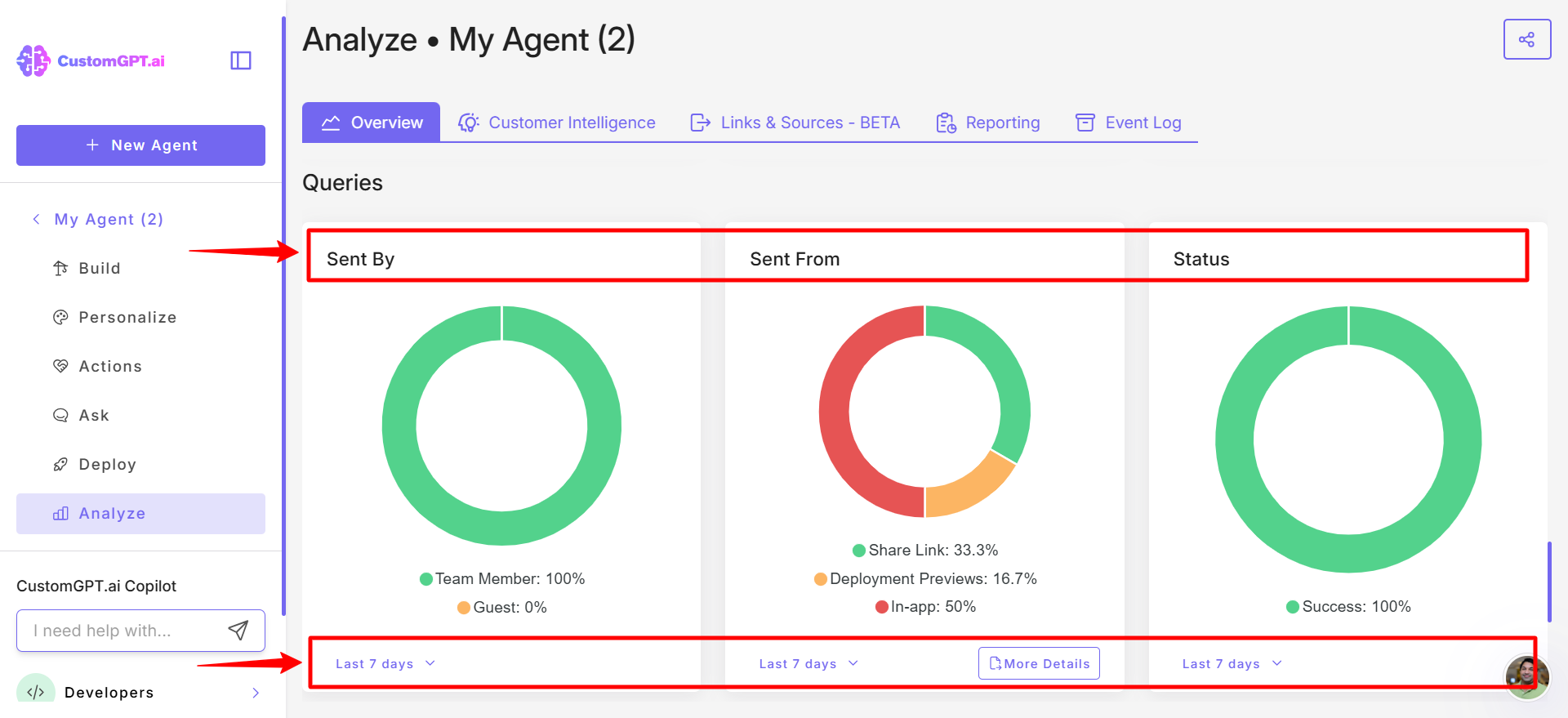 - Additional insights consistent with the current analytics interface, such as Sent By (team members or guest), Sent From, and Query Statuses (success or failure), are displayed in pie charts at the bottom of the page. You can filter the data by Today, Yesterday, Last 7 days, Last 30 days, Last month, Last year, or a Custom range.