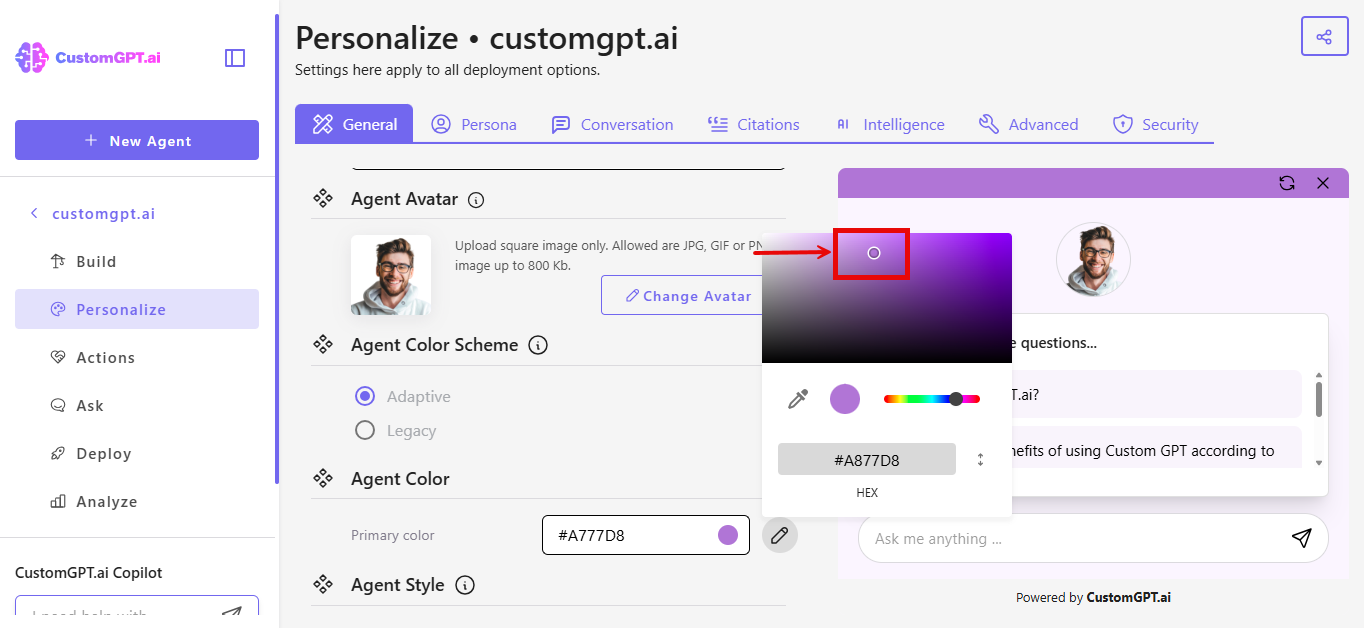 This guide explains how to change the toolbar color of your AI agent by updating the primary color.