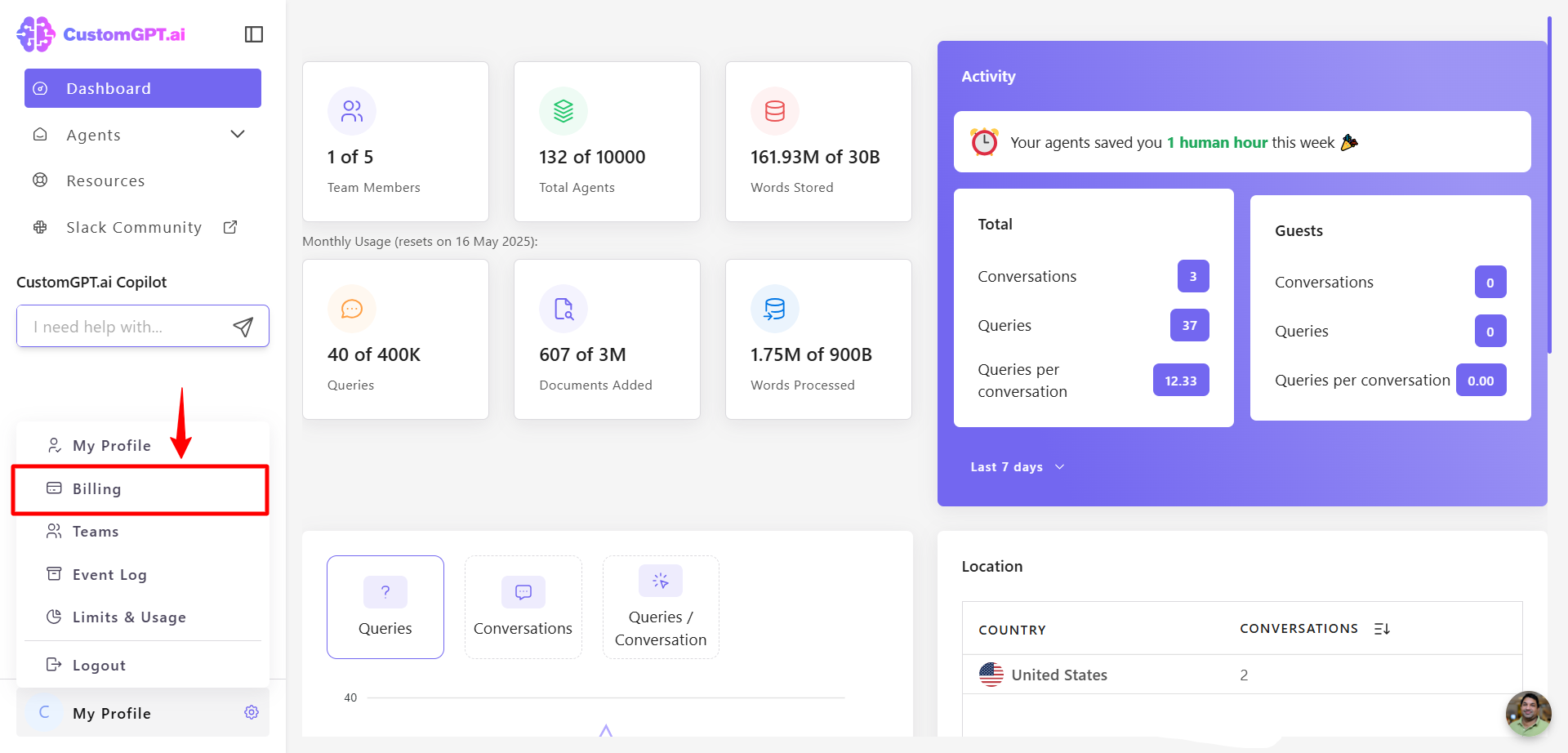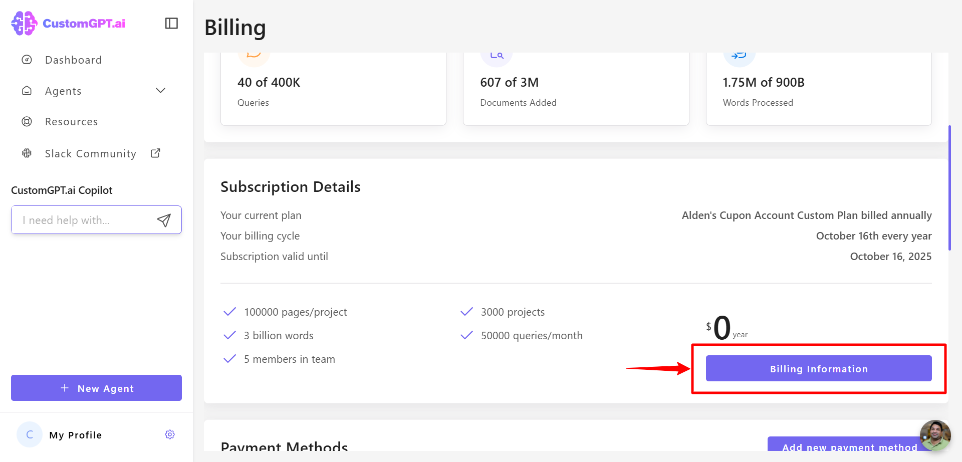 This step-by-step guide explains how to update your billing information in CustomGPT.