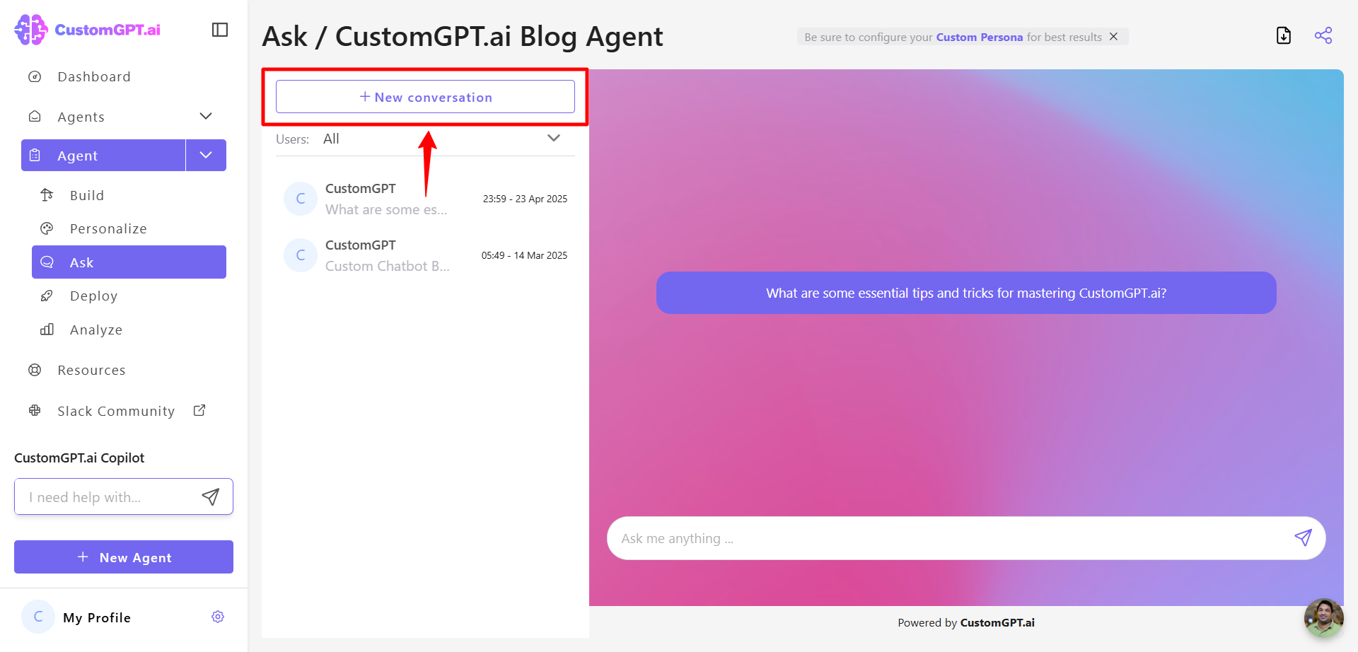 - Under Ask Me Anything, click New Conversation option to initiate the "CustomGPT demo/ Ask me anything" process.