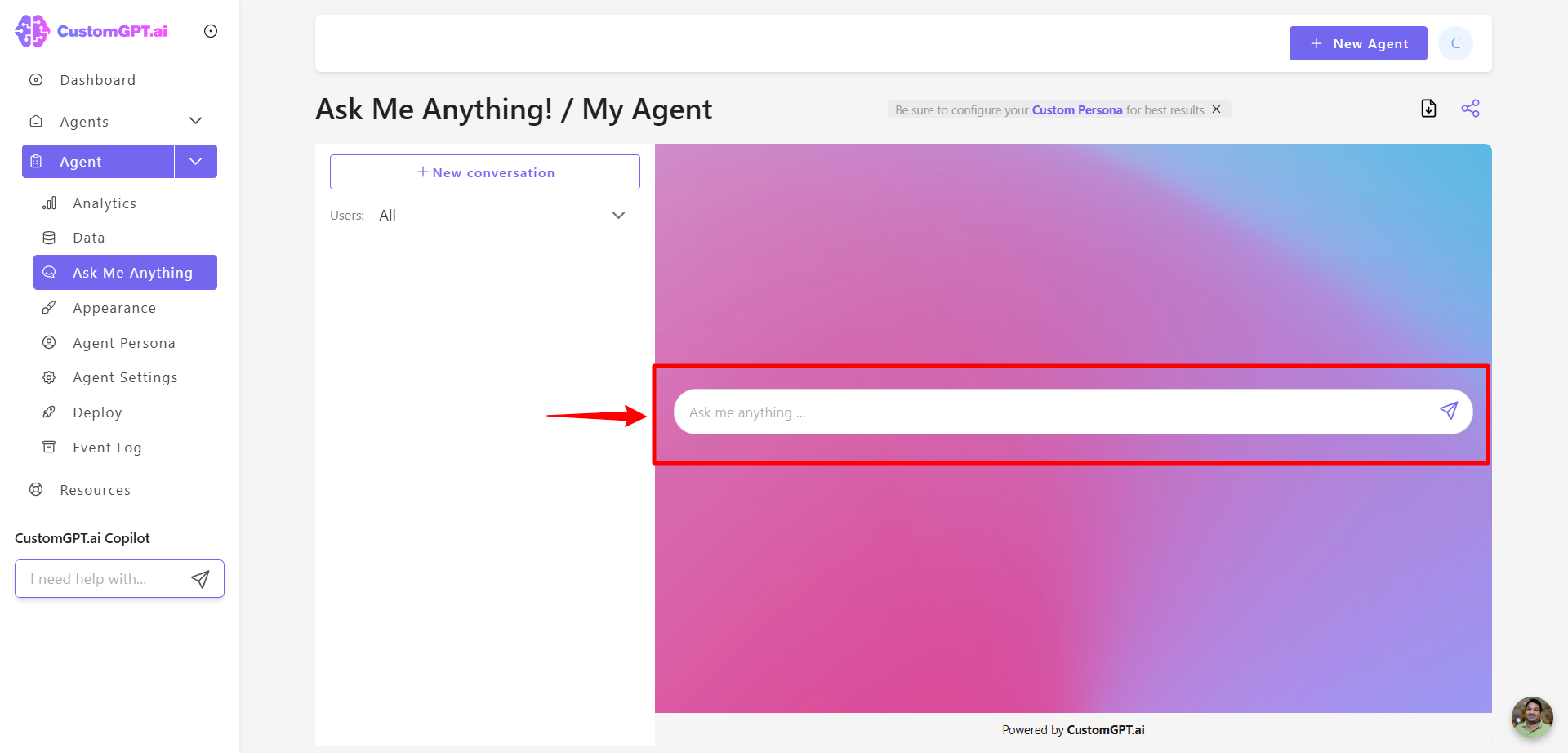 Ask Me Anything is a powerful tool that lets you interact directly with the CustomGPT AI Agent. It’s designed to provide assistance, information, and advice on any topic—whether you need help with the CustomGPT API, want to explore a feature, or just have questions.
