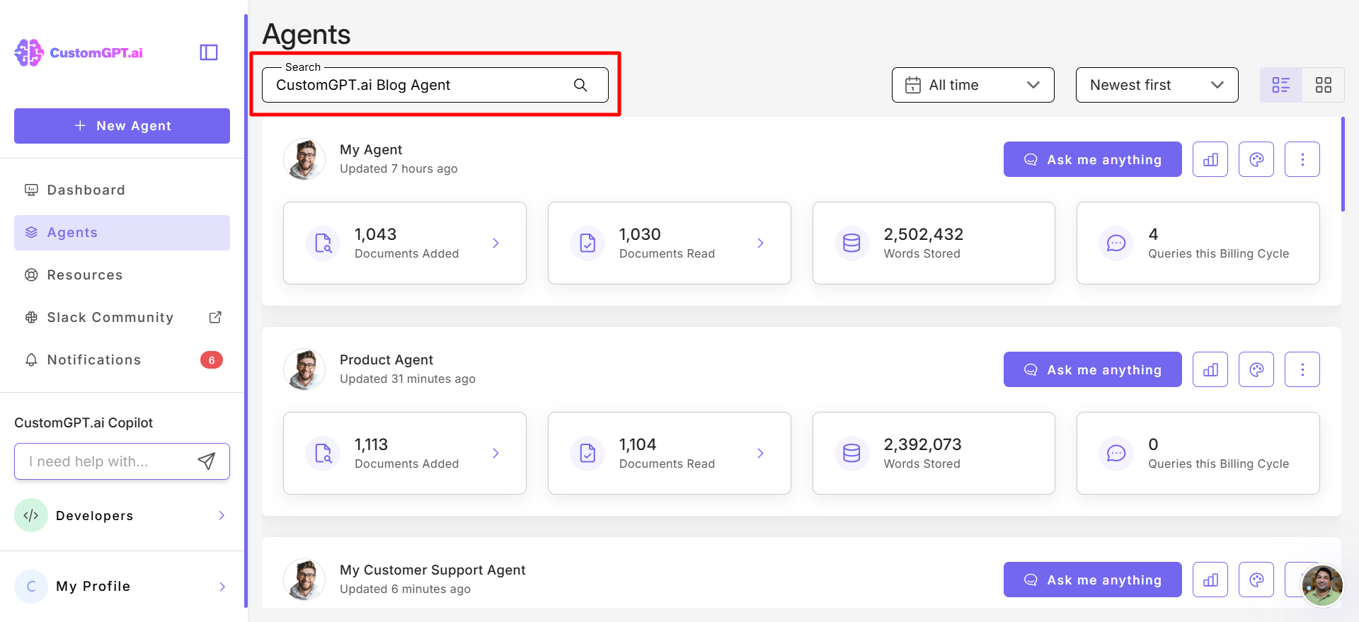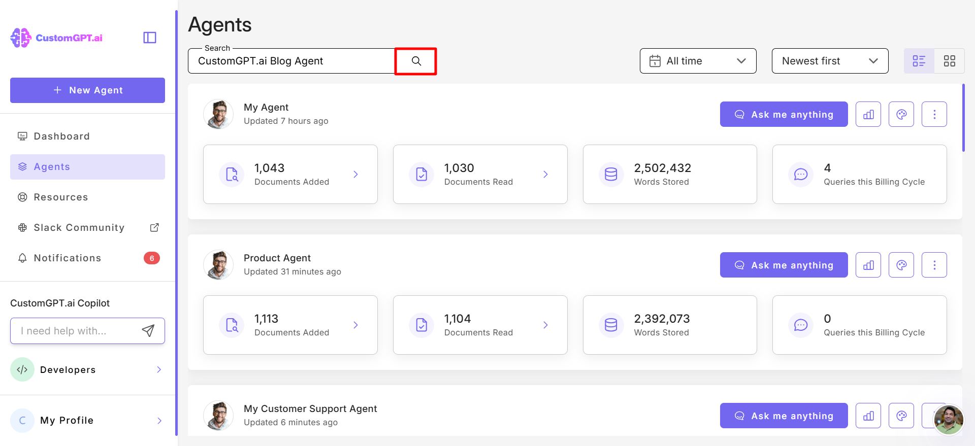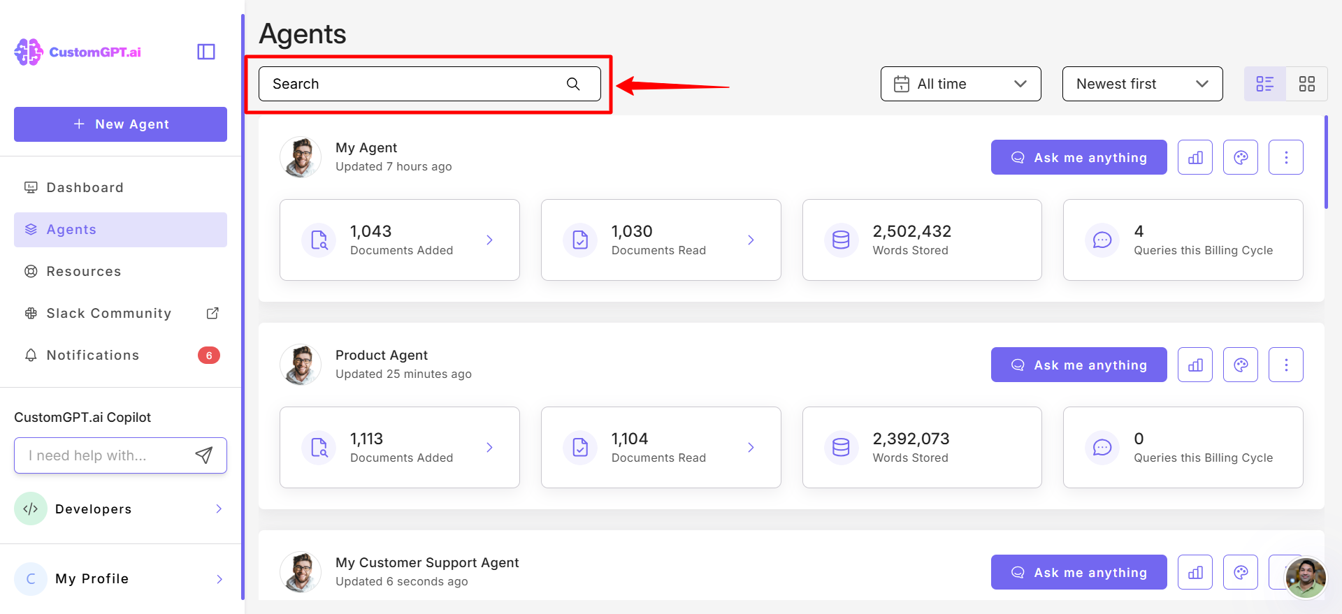 This guide explains how to use the search bar to quickly locate your agents in CustomGPT.