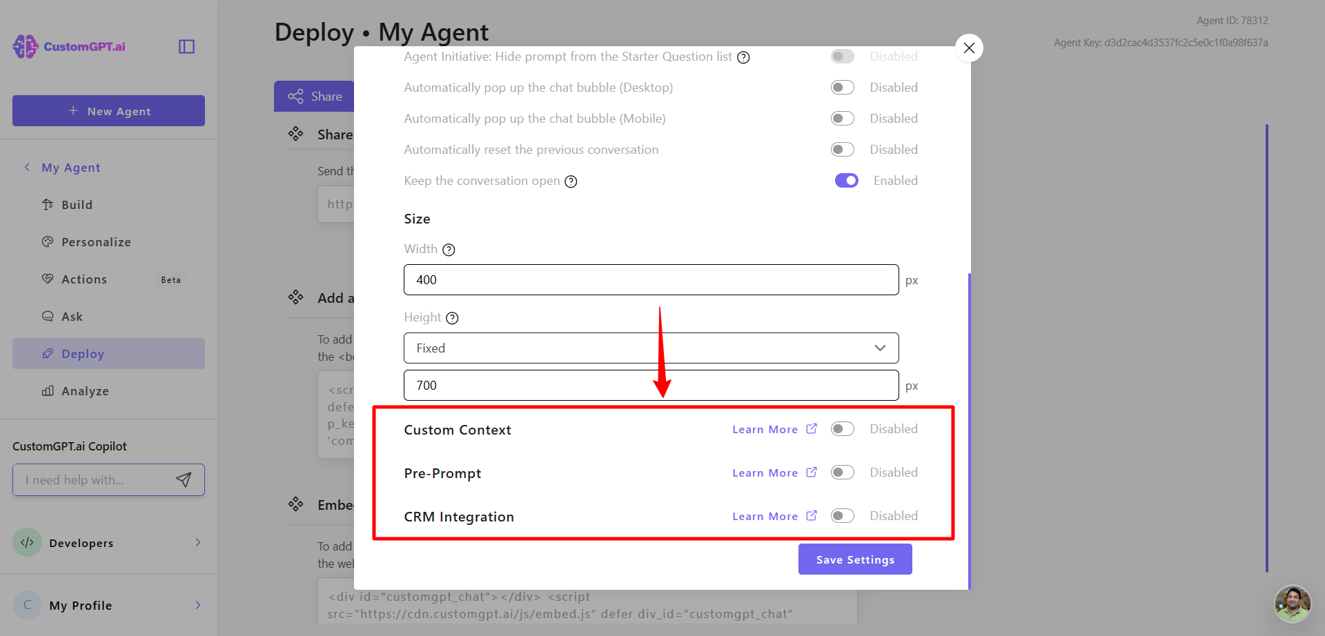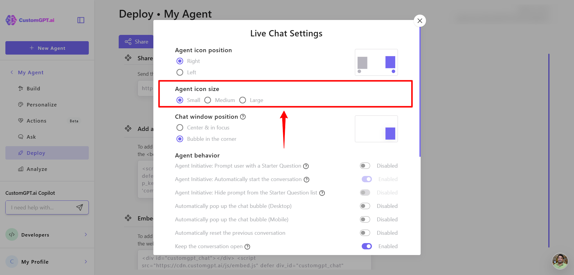 - Click the Settings icon to adjust your agent's appearance or behavior.