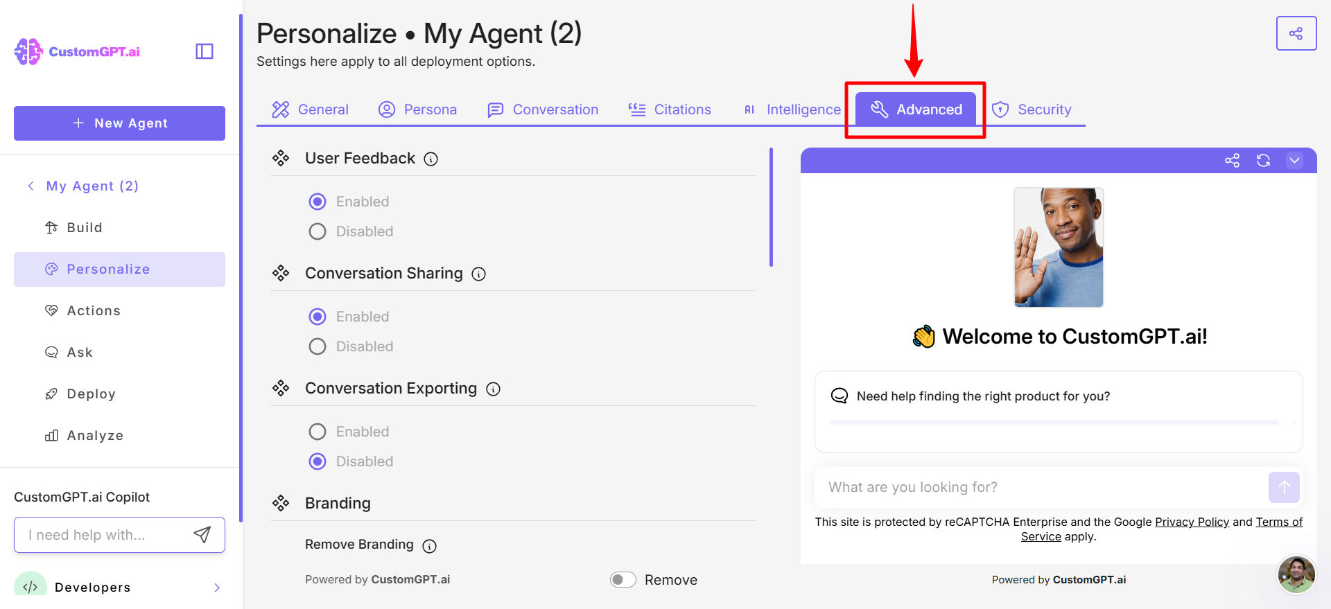 - Scroll down to the User Feedback section and click Enabled. Once enabled, your AI agent will begin collecting feedback from users, which can be reviewed and exported later.