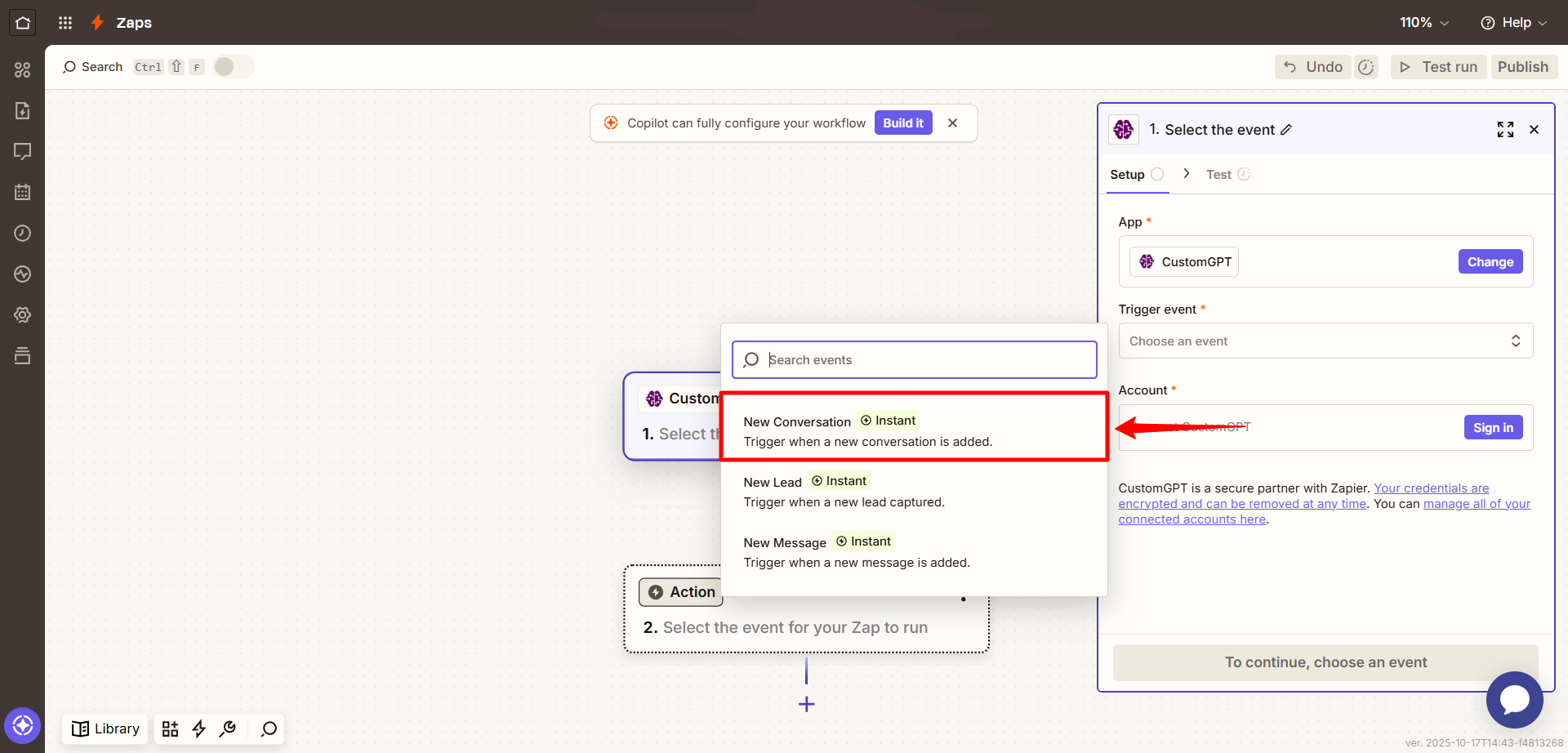 The New Conversation event is a Zapier trigger that fires whenever a user starts a new conversation with a selected CustomGPT agent.