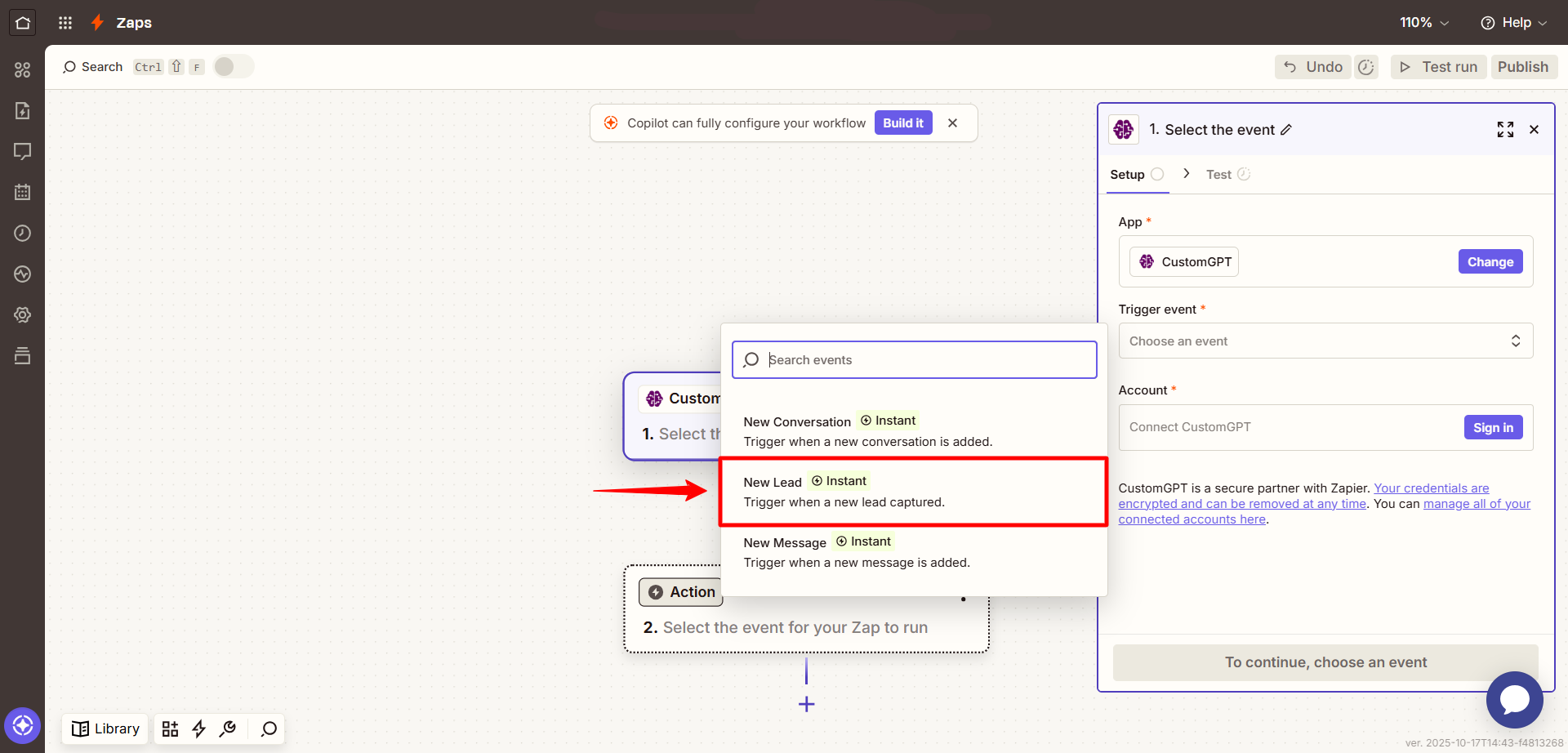 The New Lead event in Zapier is a trigger that fires when a CustomGPT agent captures a new lead during a conversation.