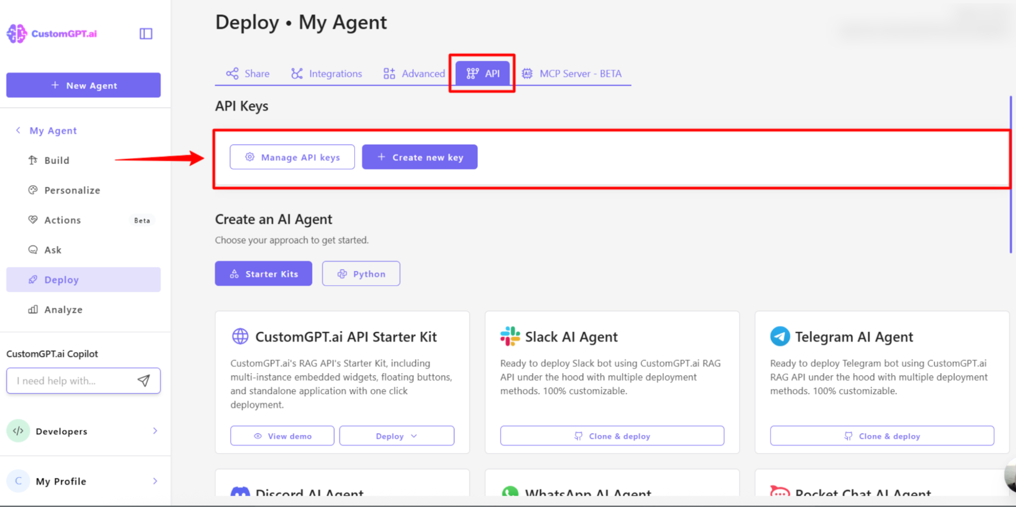 - You can get your API key from Deploy > API inside your CustomGPT dashboard.