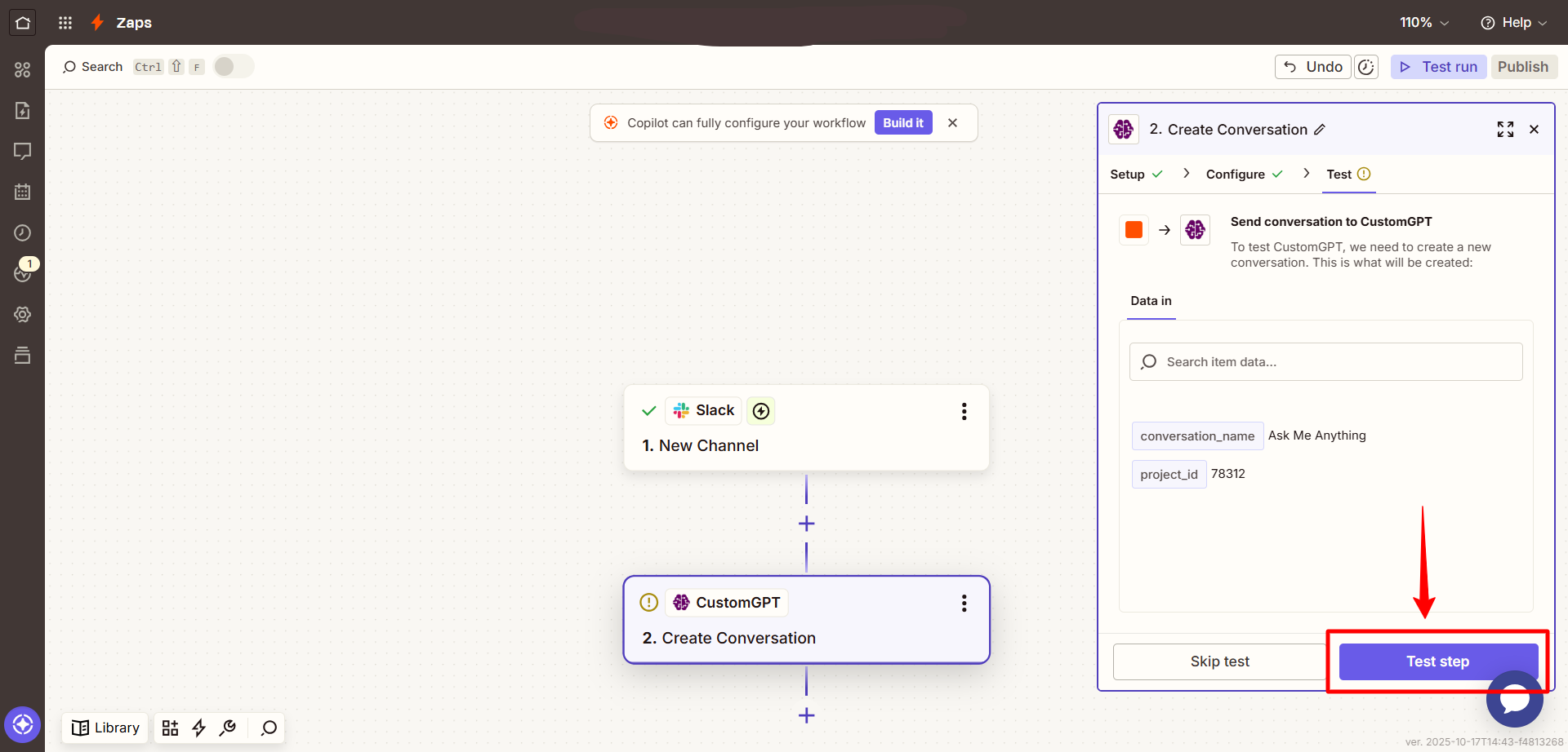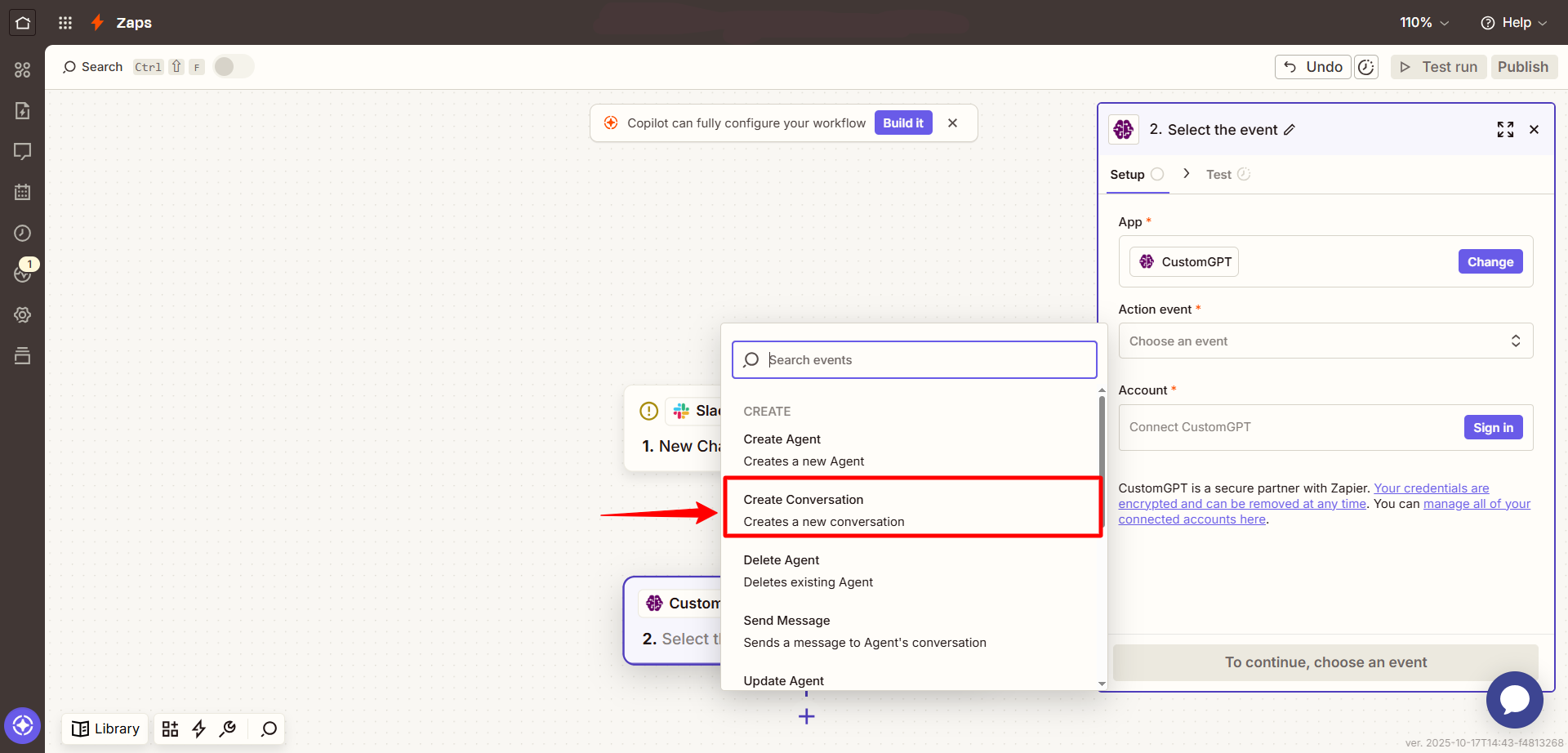 This guide shows you how to start a new conversation in your CustomGPT.ai agent using the Create Conversation action in Zapier.