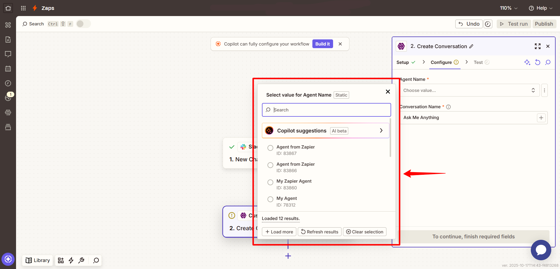The Create Conversation action allows you to start a new conversation with a specific CustomGPT.ai agent via a Zapier automation. This is useful when you want each user interaction, task, or data entry to begin in a clean conversation context—especially when sending follow-up messages later in the same flow.