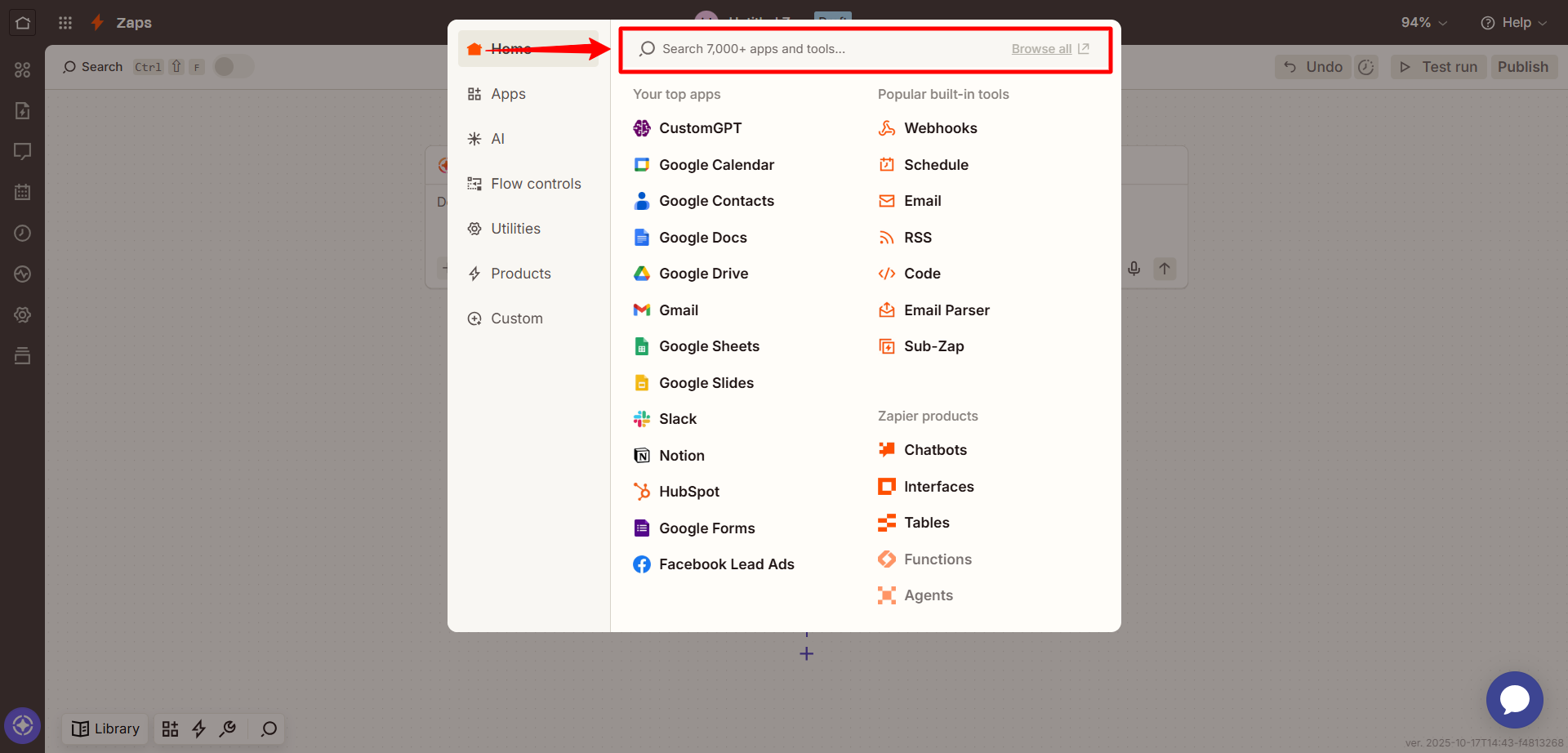 - In the Trigger section, select the app that will start the workflow (e.g., Slack, Google Drive, orany supported Zapier app trigger. ).
