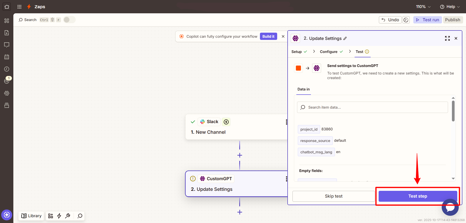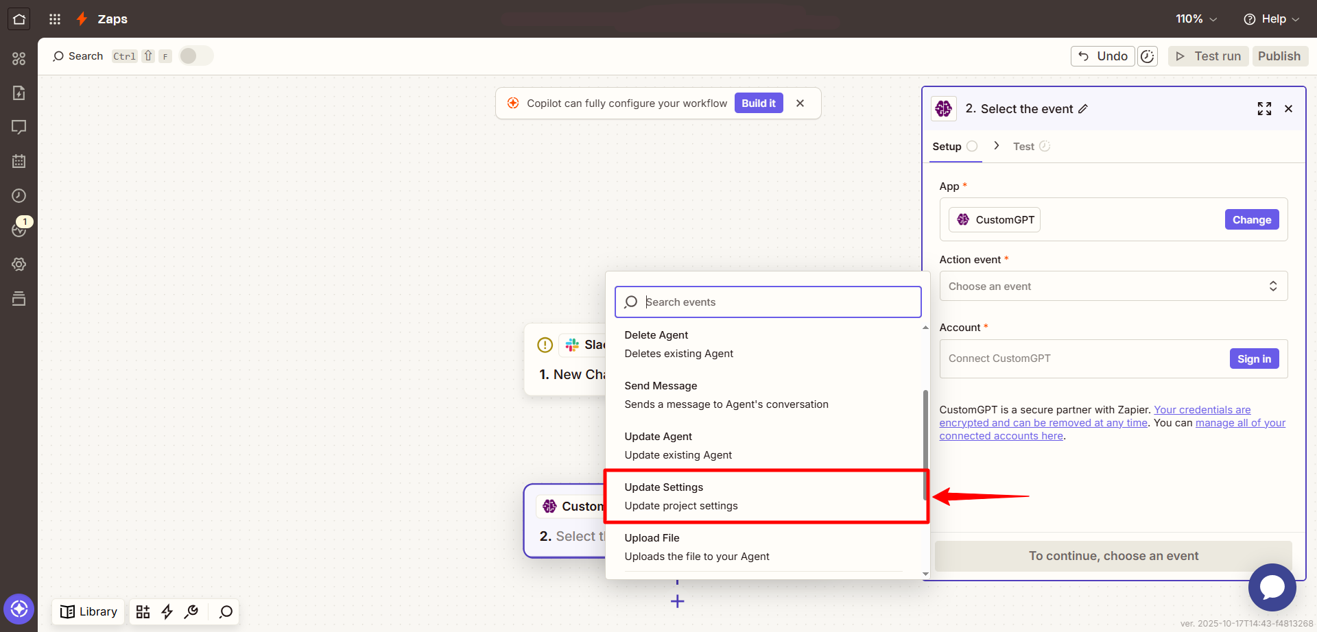 - In the Action step, search for CustomGPT.