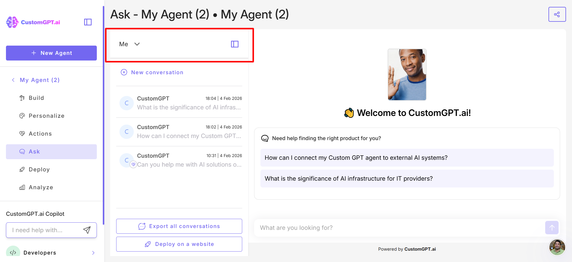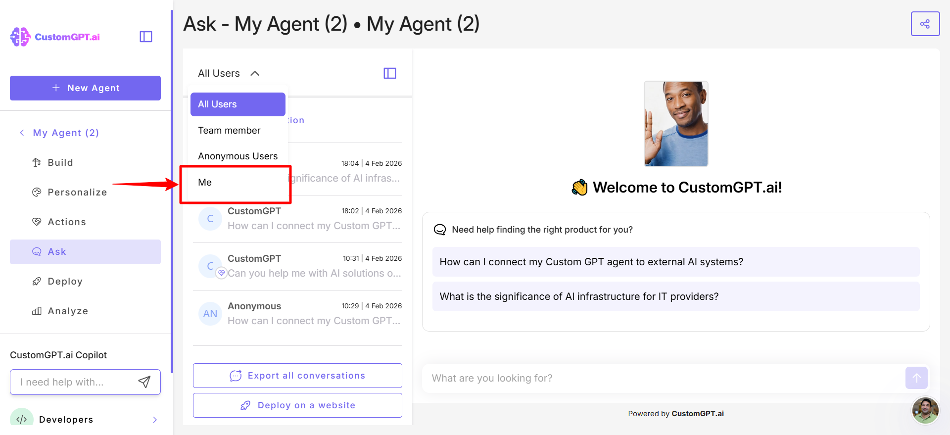 This step-by-step guide explains how to use the personal conversation view feature in CustomGPT.ai.