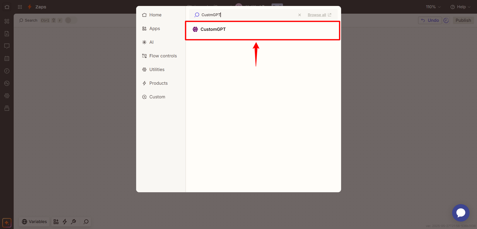 - In the Action section, click App & Event and search for CustomGPT.
