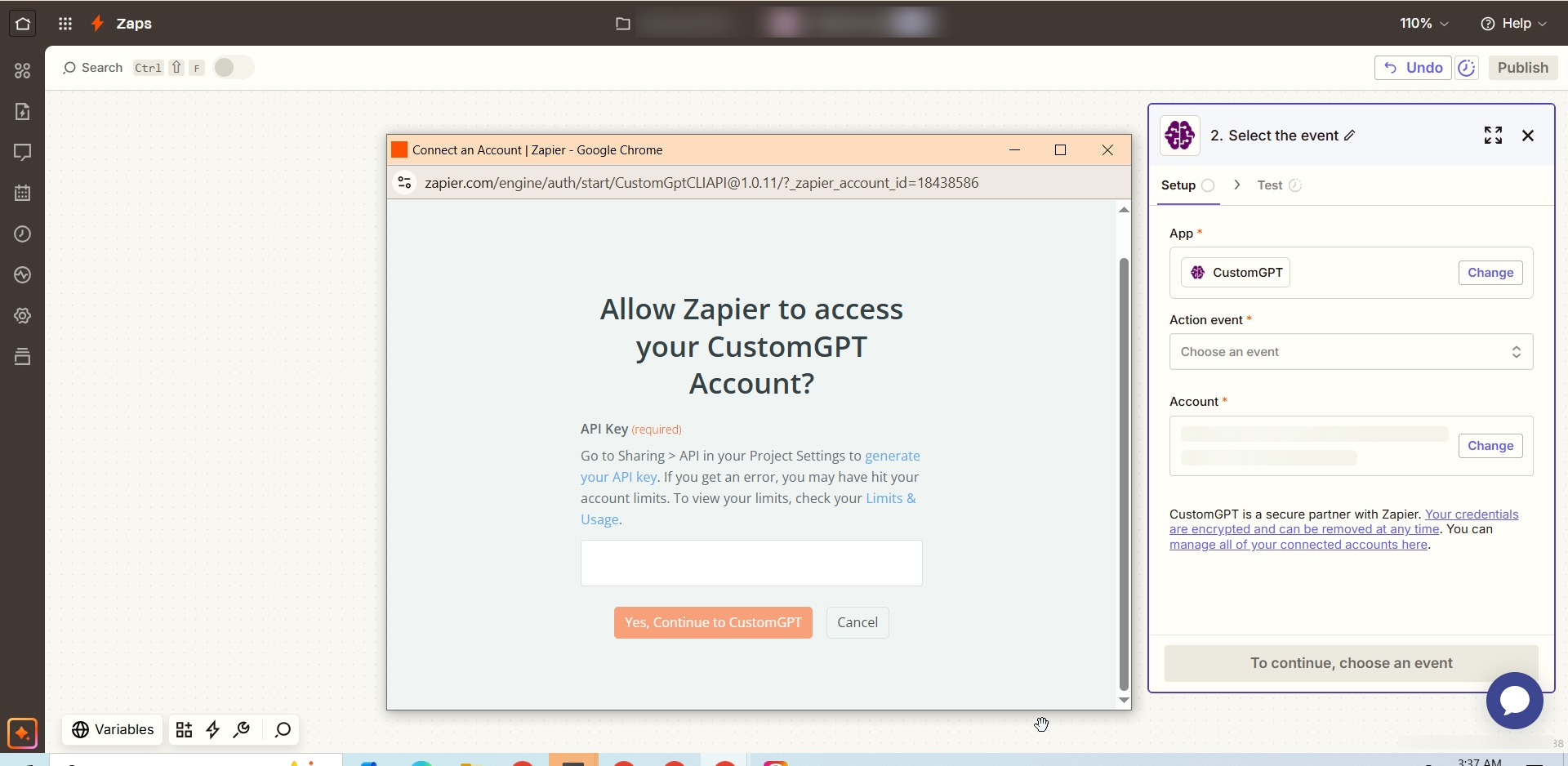 This guide walks you through how to connect the CustomGPT.ai app in Zapier and build automated workflows using supported events and actions.